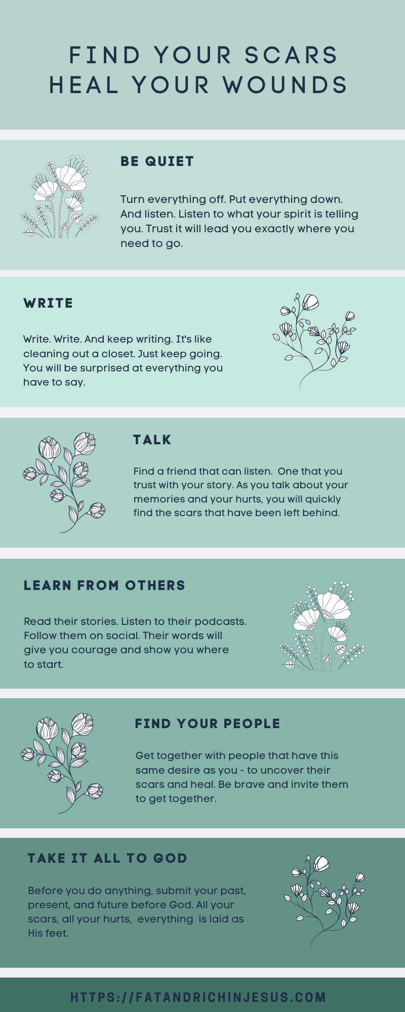 7. Find your people. Get together. Meet with people that have the same desire as you – to uncover their scars and heal. Pray for God to lead you to the right people for this group. Around seven years ago a friend of mine did this. God put ten ladies on her heart. This group has been one of the biggest blessings of my life. I have discovered and healed many wounds here.
